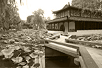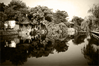 中式庭院园景的主体是自然风光,亭台参差、廊房婉转作为陪衬,寄托了园主人淡漠厌世、超脱凡俗的思想,在物质环境中寓藏着丰富的精神世界,苍凉廓落、古朴清旷是其美的特征。“崇尚自然,师法自然”是中国园林所遵循的一条不可动摇的原则,在这种思想的影响下,中国园林把建筑、山水、植物有机地融合为一体,在有限的空间范围内利用自然条件,模拟大自然中的美景,经过加工提炼,把自然美与人工美统一在一起,创造出与自然环境协调共生、天人合一的艺术综合体。苏州沧浪亭的楹联“清风明月本无价,近水远山俱有情”就表现出园主视己与自然浑同一体,陶然与自然的闲适心情。另一方面,我国的古典园林中特别重视寓情于景,寓义于物,因此人们往往把作为审美对象的自然景物看作是品德美、精神美和人格美的一种象征。